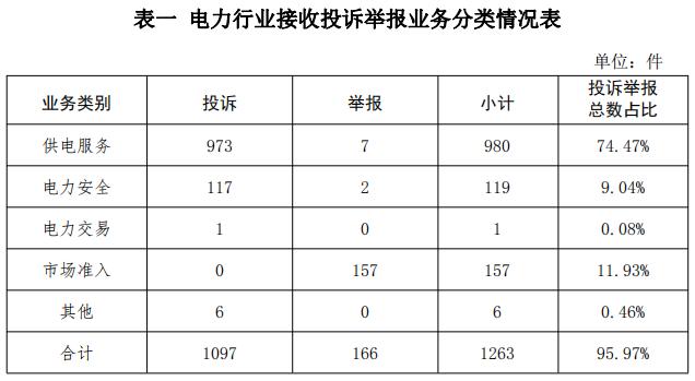 電力行業(yè)排在首位,數量為1263件、占投訴舉報總數的95.97%,主要集中在供電服務、市場準入、電力安全等方面。