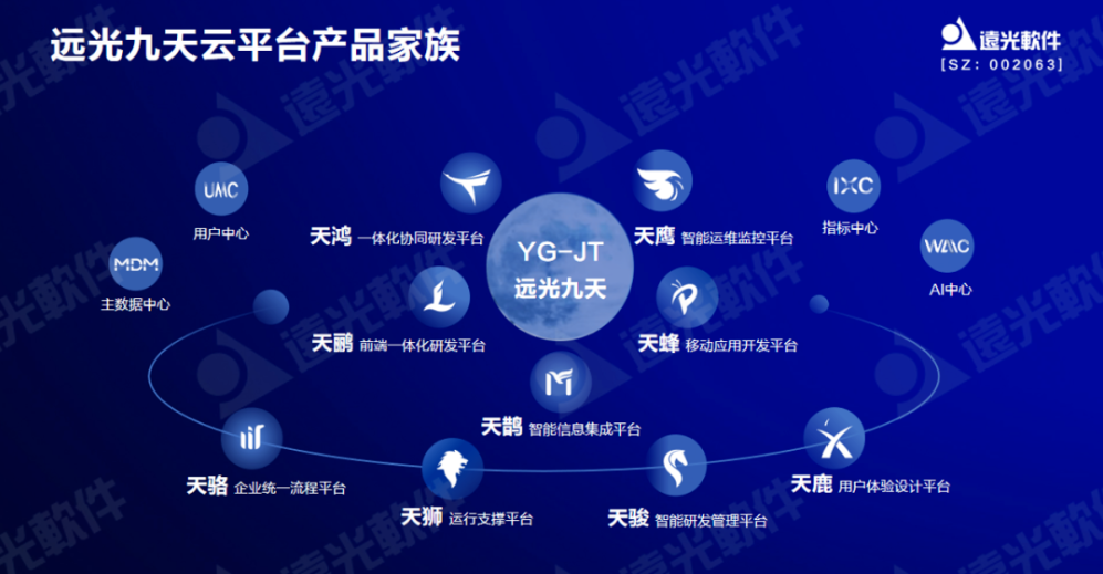 下面來介紹一下“九天”的產(chǎn)品家族。產(chǎn)品家族里的各個產(chǎn)品都是完全獨立的,同時又能相互協(xié)同,構(gòu)成完整的遠光九天智能一體化云平臺。它們從運行支撐、研發(fā)管理到一體化協(xié)同設(shè)計、運維管控等,為企業(yè)數(shù)字化轉(zhuǎn)型提供有力的技術(shù)支撐。