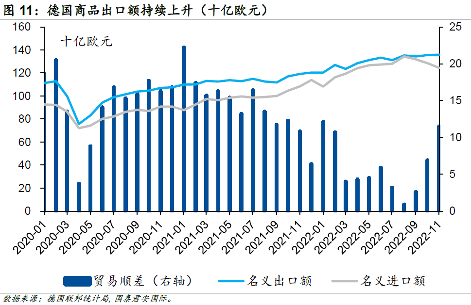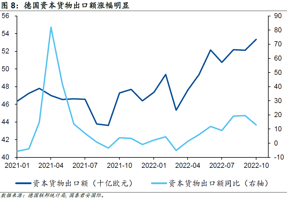 更加重要的是,為了應(yīng)對中長期能源危機(jī),歐盟各國也開始加大對制造業(yè)的支持力度,制定了“能源系統(tǒng)數(shù)字化”計(jì)劃,該計(jì)劃預(yù)期在2030年前在基礎(chǔ)設(shè)施方面投資5,650億歐元,以大力發(fā)展光伏和新能源汽車產(chǎn)業(yè);除此以外,歐盟還加大了對液化天然氣產(chǎn)業(yè)的投資力度。德國作為歐洲經(jīng)濟(jì)的最重要組成部門,受益于政策支持,其工業(yè)生產(chǎn)并沒有受到太多能源問題的干擾,尤其是核心的資本貨物出口額在衰退預(yù)期的背景下持續(xù)增長。