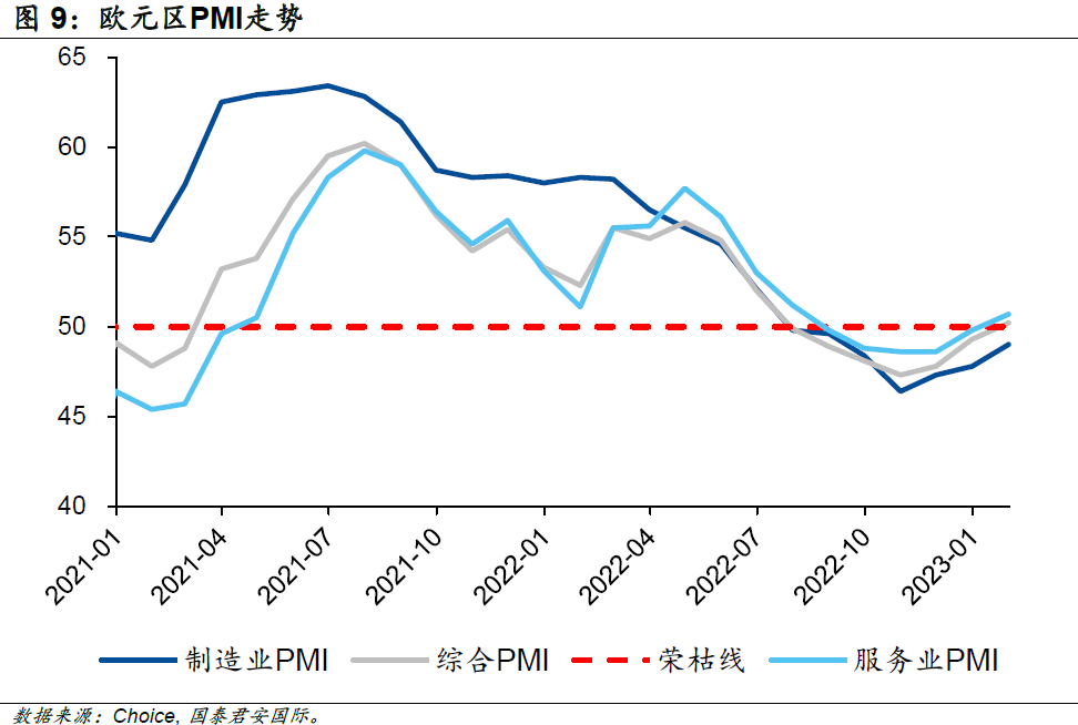 這一系列的政策效果在2022年末開始逐步顯露,歐洲的經(jīng)濟(jì)指標(biāo)開始出現(xiàn)回暖跡象。歐元區(qū)綜合PMI初值及服務(wù)業(yè)PMI初值在2023年1月扭轉(zhuǎn)了約半年的收縮趨勢,回到了榮枯線上方;雖然制造業(yè)PMI仍處于收縮區(qū)間,但是收縮幅度也大幅改善。