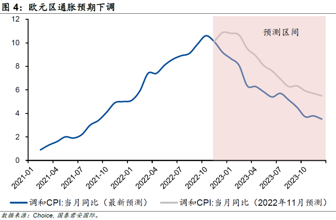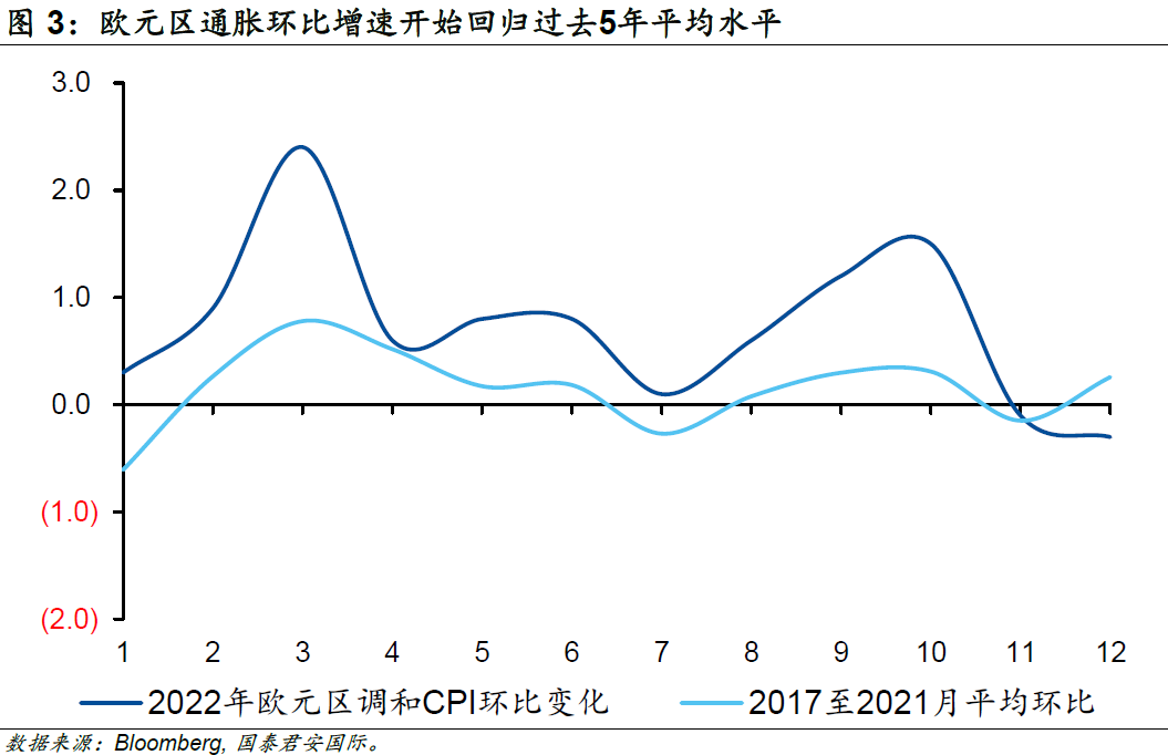 另一方面,歐元區(qū)通脹環(huán)比增速顯著高于季節(jié)性的趨勢已經(jīng)開始扭轉(zhuǎn),這意味著通脹的增長動能開始減弱,2022年11月及12月已經(jīng)連續(xù)兩個(gè)月低于歷史平均水平。