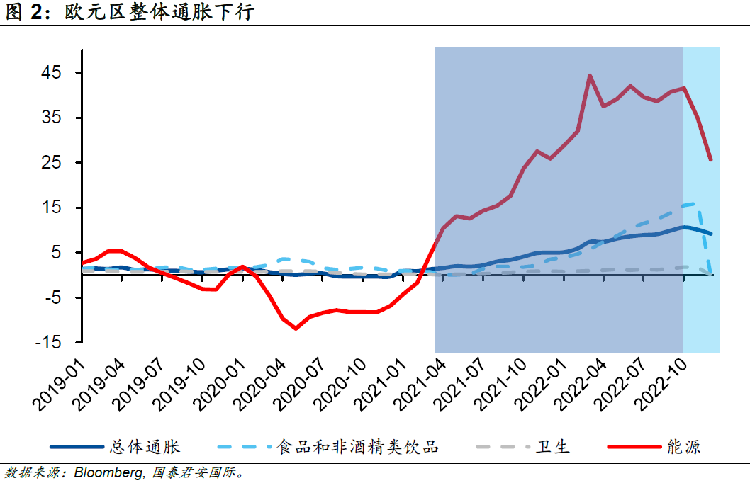 隨著天然氣價(jià)格的迅速回落,歐元區(qū)整體通脹也隨之下行。歐元區(qū)2022年12月的能源通脹已經(jīng)由同年10月最高的41.5%大幅連續(xù)回落至25.7%,受此推動,整體通脹率亦由10月最高的10.6%連續(xù)回落至9.2%。