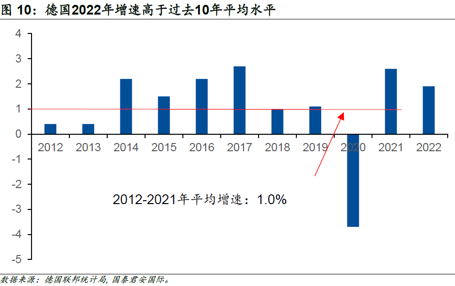 作為歐元區(qū)最大的經(jīng)濟(jì)體,近日公布的數(shù)據(jù)顯示,經(jīng)過價(jià)格調(diào)整后,德國2022年GDP同比增長1.9%,高于市場預(yù)期1.8%。不可否認(rèn)的是,俄烏沖突推升的天然氣價(jià)格給德國經(jīng)濟(jì)造成了相當(dāng)大的困擾,但是德國2022年GDP依舊增長1.9%,較2019年(新冠疫情開始前一年)高0.7個(gè)百分點(diǎn),亦高于2012年至2021年的十年平均水平(1.0%)。
