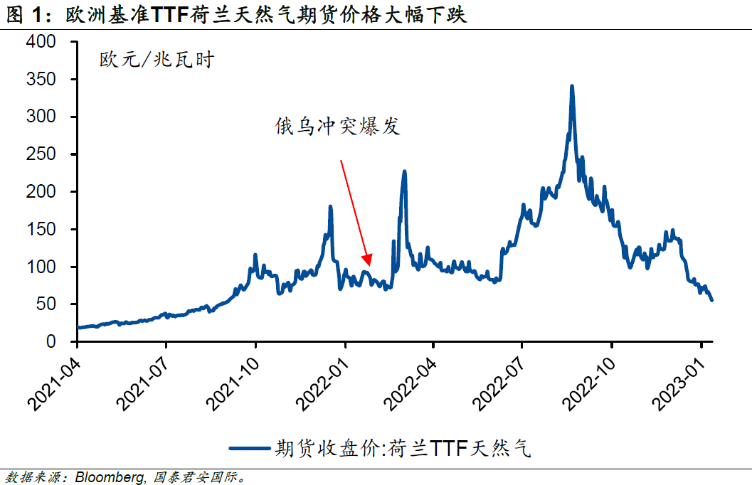 暖冬的到來極大程度上縮減了供熱對天然氣的需求,歐洲基準(zhǔn)TTF荷蘭天然氣期貨價(jià)格延續(xù)了之前的大幅回落趨勢。截至2023年1月中旬,期貨價(jià)格已經(jīng)低于俄烏沖突爆發(fā)前的水平。在天然氣價(jià)格走低的情況下,能源價(jià)格不應(yīng)該繼續(xù)推動通脹高企;另一方面,隨著中國2023年經(jīng)濟(jì)預(yù)期的大幅上修,歐元區(qū)出口有望迎來顯著改善。歐洲2023年的衰退預(yù)期似乎也應(yīng)該畫上一個(gè)問號?