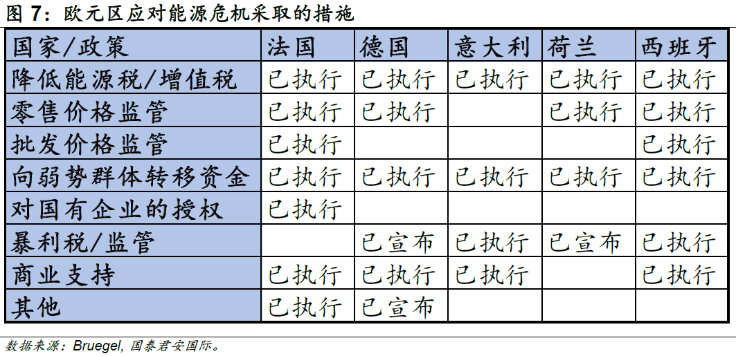 從總量政策來看,財(cái)政端的支持在很大程度上減輕了能源危機(jī)的沖擊。為應(yīng)對俄烏沖突帶來的能源問題,歐洲各國不約而同地采取了多種財(cái)政措施。根據(jù)Bruegel的統(tǒng)計(jì),歐洲各國已經(jīng)撥款7,055億歐元用于緩解能源危機(jī)帶來的影響。歐盟撥款總計(jì)6,004億歐元,其中德國支出2,640億歐元,占2021年GDP的7.4%;英國撥款970億歐元,占2021年GDP的3.5%。