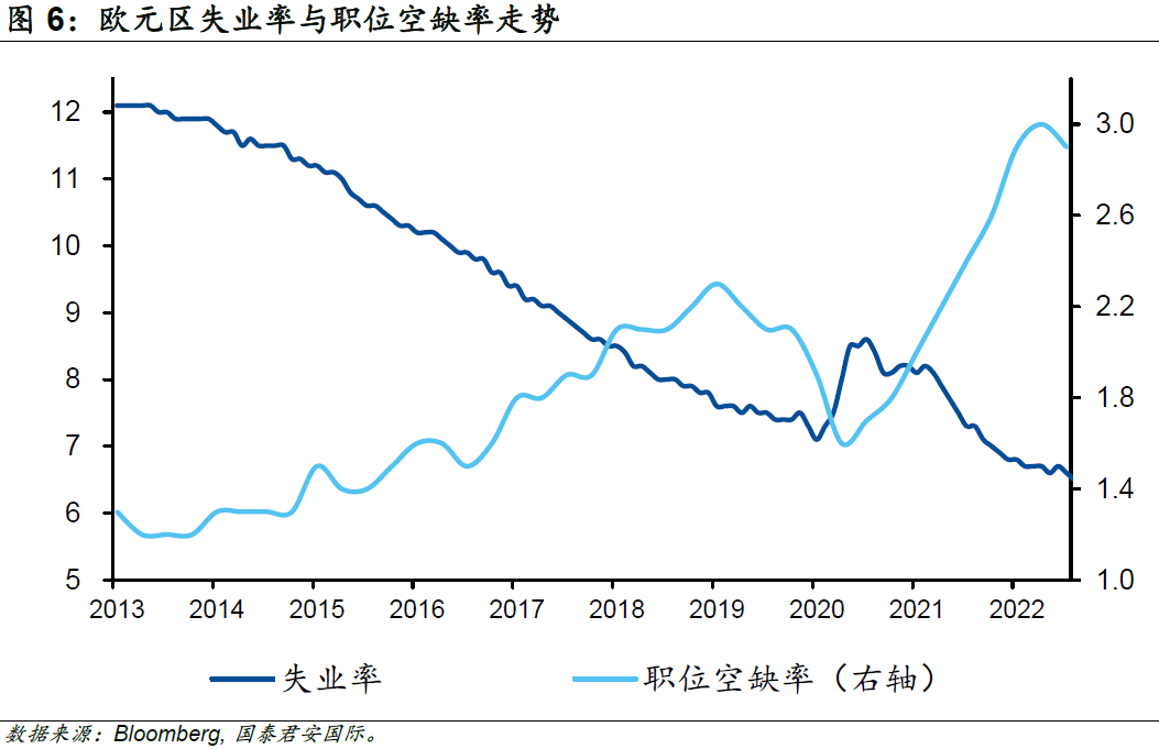如果說天氣在很大程度上幫助了歐洲人,但歐洲經(jīng)濟(jì)超預(yù)期的根本原因大概率不是因?yàn)樾疫\(yùn)或者天氣。進(jìn)一步來看,勞動力市場的火熱意味著經(jīng)濟(jì)維持著較好的動能。一方面,即使在能源價(jià)格高企的去年上半年,職位空缺率都處于上行趨勢中;另一方面,在緊張的企業(yè)用工環(huán)境中,歐元區(qū)的失業(yè)率開始走低,并迭創(chuàng)歷史低點(diǎn)。在之前通脹大幅高走的背景下,歐元區(qū)多個(gè)國家的工會已經(jīng)通過罷工的形式確定了未來的漲薪方案。與此同時(shí),歐洲央行(ECB)基于通脹補(bǔ)償?shù)目紤],在2022年12月的最新預(yù)測中將2022-2024年的累積工資增長較2022年9月的預(yù)測值上調(diào)1.4個(gè)百分點(diǎn)。