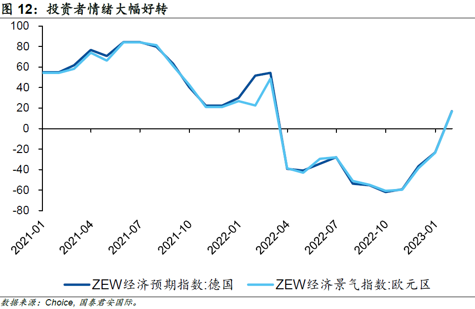 往前看,反映歐元區(qū)及德國投資者情緒的指標(biāo)“ZEW經(jīng)濟(jì)景氣指數(shù)”大幅好轉(zhuǎn)。在能源問題好轉(zhuǎn)、中國經(jīng)濟(jì)向好的背景下,能源密集型企業(yè)及出口型企業(yè)的盈利預(yù)期也開始上修,2023年1月德國ZEW經(jīng)濟(jì)景氣指數(shù)錄得16.9,遠(yuǎn)超預(yù)期值-15及前值-23.3。