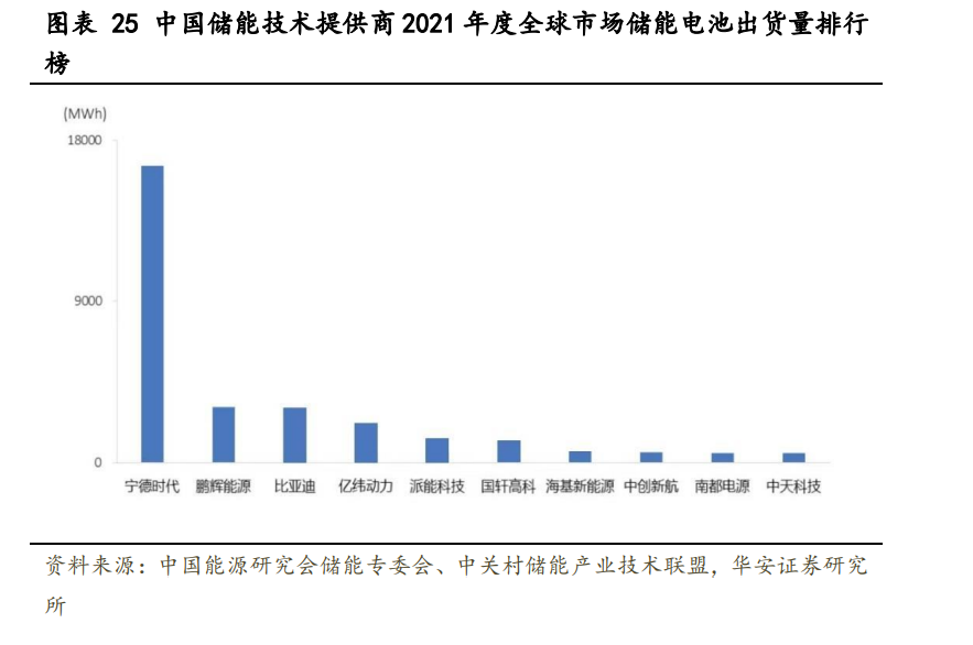 與動力和大儲相比,戶用儲能對電芯技術(shù)的要求相對放寬。戶用場景對電池能量密 度等要求相對較低,影響用戶體驗的主要是產(chǎn)品整體設(shè)計,包括電池管理和全屋能源調(diào) 配等,對電芯性能的要求相對放寬,主要強調(diào)安全性和降本。 封裝路線尚無定型。戶用儲能系統(tǒng)規(guī)模在 10kWh 級別,大圓柱電池(單體容量 10Ah50Ah),方形(50Ah-300Ah),軟包(30Ah-80Ah)方案均有公司選用,目前戶儲采用的 電芯封裝路線并無定型。 小電芯或?qū)⒊蔀閼魞χ髁?。?dāng)前歐洲戶儲市場正經(jīng)歷低壓向高壓系統(tǒng)的產(chǎn)品迭代。 高電壓平臺可降低電流,從而控制系統(tǒng)發(fā)熱量,提高放電效率。儲能系統(tǒng)容量不變的情 況下,高壓系統(tǒng)對應(yīng)的電芯容量減小。例如,低壓平臺儲能電芯多為 100Ah,高壓平臺逐 漸向 50Ah 過渡。100Ah 以下小容量電池在戶用家儲領(lǐng)域仍有較長的應(yīng)用生命周期。 目前我國主要儲能電池提供商多為動力電池制造商。根據(jù) GGII 統(tǒng)計,2021 年國內(nèi) 儲能電池出貨量 48GWh,其中電力儲能電池出貨量 29GWh,同比增長 339%;而根據(jù)全球 研究機構(gòu) EVTank 與伊維經(jīng)濟研究院共 2021 年全球儲能電池出貨量 66.3GWh,同比增長 132.6%,電力系統(tǒng)儲能是主要增量貢獻。2021 年,全球市場中,儲能電池出貨量排名前 十位的中國儲能技術(shù)提供商,依次為:寧德時代、鵬輝能源、比亞迪、億緯動力、派能 科技、國軒高科、?;履茉?、中創(chuàng)新航、南都電源和中天科技。