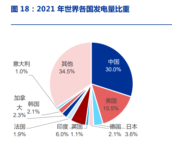 我國(guó)面臨著人類(lèi)歷史上最為艱巨的新能源轉(zhuǎn)型之路。中國(guó)如今已經(jīng)擁有全世界最大的 電力系統(tǒng),2021 年我國(guó)發(fā)電量占全球比例已達(dá)到 30%,接近第二名美國(guó)的 2 倍,更重要 的是我國(guó)的用電規(guī)模仍在快速增長(zhǎng),2021 年我國(guó)全年新增發(fā)電量達(dá) 7552 億千瓦時(shí)(BP 口徑),是德國(guó) 2021 年全國(guó)用電量的接近 1.3 倍,而德國(guó)總發(fā)電量從近 20 年基本維持在 穩(wěn)定水平。