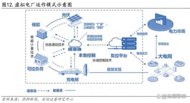 未來隨著電力市場(chǎng)成熟,工商業(yè)儲(chǔ)能也可以通過虛擬電廠以聚合的方式參與電力市場(chǎng)交易。虛擬電廠是應(yīng)用先進(jìn)的通訊和控制技術(shù),實(shí)現(xiàn)對(duì)大量散布的分布式資源的聚合調(diào)控,使這些分布式資源規(guī)?;⒕邆鋮⑴c電力系統(tǒng)運(yùn)行調(diào)度的資格和能力。“虛擬”的含義是這些資源并非真正的發(fā)電廠,而是對(duì)分布式資源的聚合,“電廠”的含義是能夠像真正的發(fā)電廠一樣為電力系統(tǒng)提供電能量和輔助服務(wù)。