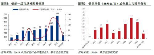從儲能公司投融資角度來看,近兩年儲能一級和二級市場投融資熱度高漲。不完全統(tǒng)計數(shù)據(jù)顯示,截至2023年一季度,300余家儲能企業(yè)獲得融資,涉及投融資事件900余件、已披露融資金額近2000億元。其中,2021年儲能披露融資金額近600億元,2022年儲能行業(yè)全年融資189次。二級市場方面,近三年儲能相關公司IPO多達97家,占儲能指數(shù)(885921.TI)比重達24.8%,此外也有部分上市公司于近些年實現(xiàn)儲能業(yè)務的突破和轉型。