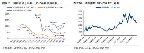 通過裝機增長率看儲能行業(yè)所處發(fā)展位置,當前儲能裝機兩年復合增長率在00%上下,相當于風電、光伏行業(yè)發(fā)展早期。我們對儲能行業(yè)發(fā)展大勢的研判如下: