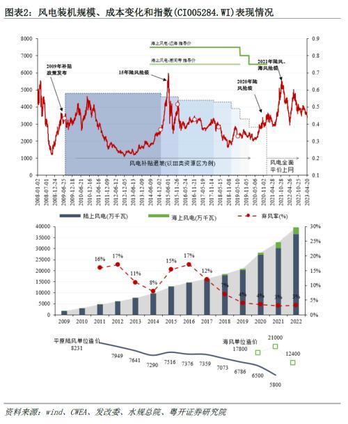 盡管行業(yè)遭受強監(jiān)管,投資熱情受到短暫性的壓制,但在持續(xù)的研發(fā)投入和項目實踐中,風電成本快速降低。風電的經(jīng)濟性改善促使了國家補貼逐步退坡,由此引發(fā)了補貼退坡時點前的風電“搶裝潮”,在業(yè)績高增預期之下指數(shù)開啟搶裝驅動的階段性上漲行情。