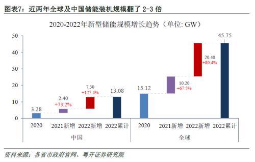 2021年以來全球儲能行業(yè)快速發(fā)展,尤其是中國儲能裝機規(guī)模飛速增長,單年新增規(guī)模均超過上年累計總裝機規(guī)模,截至2022年底中國新型儲能裝機規(guī)模13.08GW,占全球新型儲能裝機的28.6%,較2020年底中國累計裝機提高298.8%。