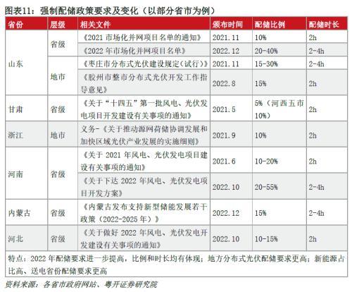 強制配儲政策客觀上拉動儲能裝機需求。2021年2月,國家發(fā)改委、能源局出臺《關于推進電力源網(wǎng)荷儲一體化和多能互補發(fā)展的指導意見》,明確增量風光儲一體化要優(yōu)化配套儲能規(guī)模,充分發(fā)揮儲能調峰、調頻作用。5月出臺的《關于2021年風電、光伏發(fā)電開發(fā)建設有關事項的通知》也指出保障性并網(wǎng)以外的項目,需通過自建、合建共享或購買服務等市場化方式落實并網(wǎng)條件后并網(wǎng)。自此,多地相繼發(fā)布電源側風光強制配儲政策,多要求10%/2h的配置比例和時長,并且政策要求逐漸向15-30%和4-5h的高比例、長時儲能發(fā)展。事實上,多地風光項目招標競爭過程中,實際配儲情況高于政策要求。