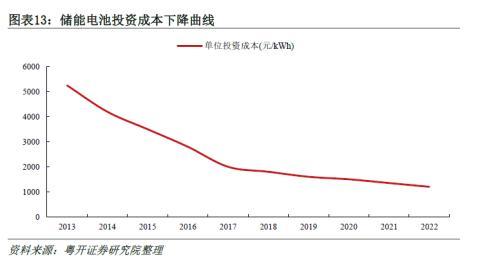 在持續(xù)技術研發(fā)投入和規(guī)模效應下,儲能成本快速下降。以鋰電池儲能為例,得益于新能源汽車和儲能行業(yè)共同發(fā)展,鋰電池儲能成本以年均15%的速度下降,2013年鋰電儲能建設成本約為4.5-6.0元/Wh,2017年成本降至1.6-2.0元/Wh,近兩年受上游鋰價上漲影響,鋰電儲能成本降幅放緩,2023年上半年鋰電儲能成本約為1.24-1.61元/Wh。
