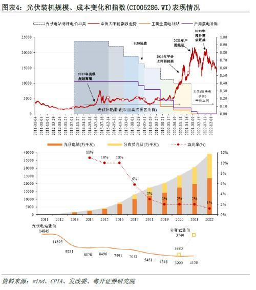 3、具體來看:1)風電呈現(xiàn)周期性行情:三上漲與兩回調交錯,對應行業(yè)擴張與嚴監(jiān)管交替。風電周期性行情與行業(yè)供需均衡情況相匹配,行業(yè)快速擴張或增速放緩背后的原因在于政策引導或限制需求,復盤風電發(fā)展和指數(shù)表現(xiàn),我們發(fā)現(xiàn)風電行情周期大約在5年左右,每2-3年進行一次峰谷切換。2)光伏“四上一下”行情:規(guī)劃、補貼和需求是驅動因素。單復盤光伏指數(shù)走勢,光伏1-2年出現(xiàn)一波行情,但結合行業(yè)監(jiān)管和企業(yè)出清來看,光伏產業(yè)發(fā)展和行情周期仍為5年左右,期間受補貼退坡等事件驅動,指數(shù)出現(xiàn)階段性行情。